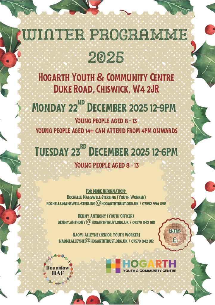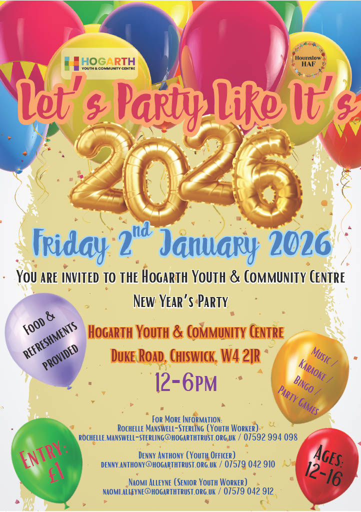 You are invited to the Hogarth Youth & Community Centre New Year’s Party. To be held on Friday 2nd January 2026.